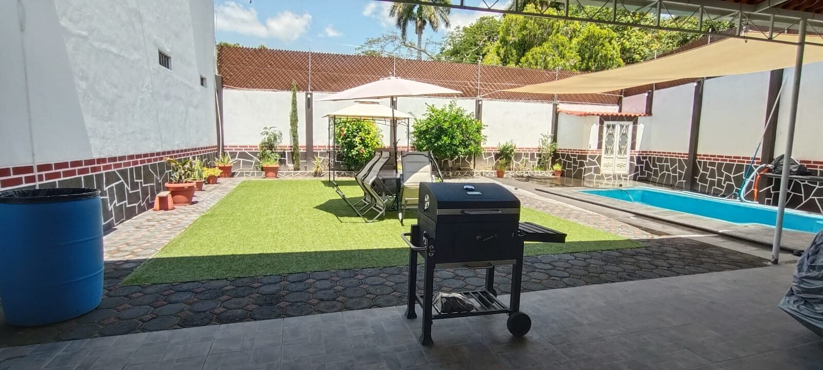 Sombrillas y mesa de jardín • Baño de estancia junto a la alberca • Asador • Espacio ideal para convivir